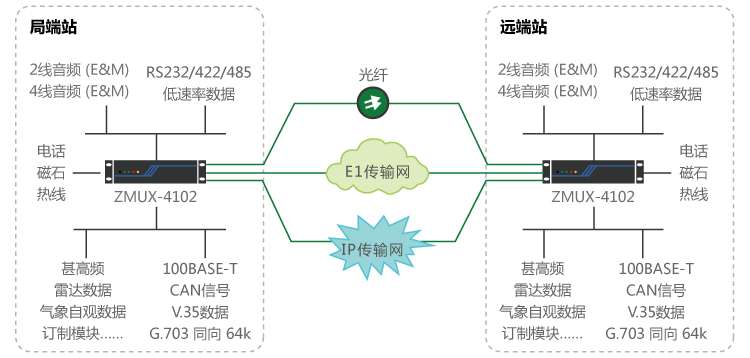 基于IP專線、光纖線路、E1 線路自動切換:遠端站到局端之間,租用運營商IP專線與E1線路、光纖線路,通過接入ZMUX-4102平臺,完成IP專線與E1線、光纖線路自動切換功能,保障甚高頻、雷達數據等業(yè)務的安全可靠性傳輸。